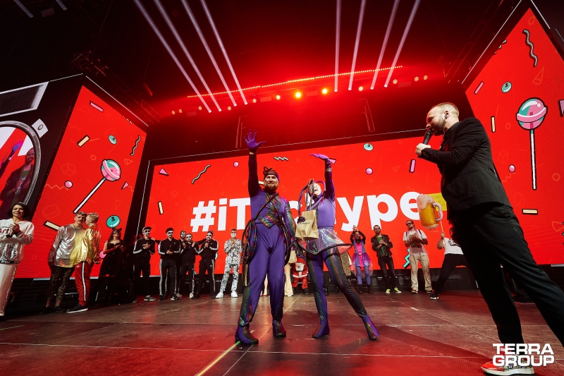 Краткое описание: В этот вечер, стены ледовой арены буквально впервые видели такое количество стильных и хайповых людей. Мощный звук разрывал колонки, яркие цвета создавали иллюзию настоящего рейва, многочисленные тематические фотозоны и зоны активаций взывали как к воспоминаниям о любимых вещах из юности, так и модных хайповых темах уходящего года. Всё в этот вечер было направлено на то, чтобы каждый сотрудник смог по-настоящему отбросить все маски и предрассудки и уйти на зов тусовки, приняв участие в самом масштабном конкурсе костюмов, на котором было зарегистрировано более 100 участников, победителей которого выбирало народное голосование с помощью лайков. А самая хайповая рейв-группа «Little Big» и огромная сцена в виде гигантского магнитофона помогла каждому сотруднику влиться в этот вайб хайпа:).