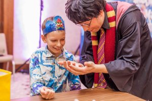 Краткое описание: Погружение в тематику мероприятия с помощью присвоения каждой возрастной группе магического талисмана – патронуса. В этот день на площадке находилось около 600 юных магов, которые прошли своё обучение на факультетах Aeris, Aqua, Terra и Ignis под знаком Зайчика, Персидского Кота, Горностая и Совы – самых мудрых и магических патронусов. Организация входной зоны с использованием тематических боверов для каждой возрастной группы. Каждый ребёнок получил тематическую корону волшебника, дневник с магическими науками, ланчбокс, а в конце мероприятия индивидуальный подарок с символом своего патронуса. Организация логистики с помощью магов-учителей. Каждую возрастную группу сопровождали актёры-аниматоры в образах волшебников, которые занимались с детьми на магических уроках. Организация квестовой механики мероприятия. Каждый ребёнок, после изученного урока получал часть стикера-мозаики, который в конце собирался в патронуса соответствующей возрастной категории за которого юные волшебники получали свои подарки. Переоборудование площадки отельного типа в школу магии и волшебства посредствам использования множества декораций в виде ростовых фигур патронусов, различных тематических баннеров и подвесных конструкций. Погружение самых маленьких гостей в тематическую сказку. Для них один из залов был полностью переоборудован в зимний лес, в котором каждый ребёнок смог увидеть новую постановку «Белая Сказка» от тетра «Бусы». Переоборудование одного из залов в огромную игровую комнату, где каждый ребёнок погрузился в изучение современных строений с помощью игрушек «Полесье». Создания атмосферы магии и волшебства с помощью привлечения живой совы «Букли» с которой каждый настоящий маг смог поговорить и рассказать своё самое сокровенное желание.