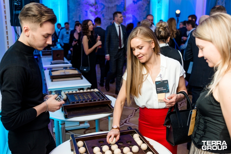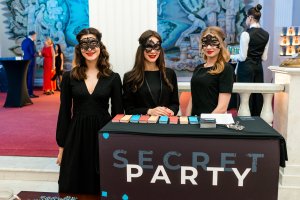Краткое описание: Мероприятие проходило в Дипсервис Холле. Перед входом в основной зал была расположена зона регистрации. В холле расположились фотозона и приветственные напитки, где гости фотографировались и отдыхали перед началом основной части. Фуршетные линии находились в Голубом зале, что позволило гостям свободно общаться и хорошо проводить время. Вечер начался со вступительных слов руководителей и преподавательского состава, далее последовало торжественное открытие. Гости погрузились в атмосферу Secret Party и началась основная часть мероприятия. В программе вечера были зоны активаций: винное и сырное казино, рулетка, покер, игра «Мафия», деревянные игры. Также была проведена игра Kahoot и Интуиция, в качестве основной тематики была задана информация об ИПМ. В течение основной части ведущий благодарил партнеров мероприятия за сотрудничество. Во время мероприятие проходил Барный квест, который выполнял функцию нетворкинга. На входе гостям раздавались барные бейджи с определенным ингредиентом коктейля. Гостям необходимо было найти выпускников с недостающим ингредиентом и отправиться на бар за коктейлем. Также гостям раздавались призовые фишки для участия в финальном розыгрыше призов от партнеров мероприятия. Также фишки раздавались за победу в зонах активаций и интерактивных играх. В качестве призов выступали брендированные часы, сертификаты Академии Собственника и сладости от партнеров.