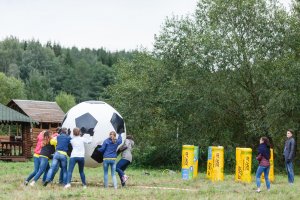 Краткое описание: мероприятие началось со встречи белорусским коллективом «Белы Птах», после этого Гости приступили к теоретической части тимбилдинга и презентации нового продукта. Ну а для того, чтобы знания сохранились, мы организовали активную часть тимбилдинга, на которой нужно было на время преодолеть этапы, используя стекловату. Поделив Гостей на команды, им предстояло катить, преодолевать препятствия, сбивать и спасать от воды материал. А завершился тимбилдинг теплым ниточным флешмобом, кусочек которого теперь хранится на память в офисе компании.